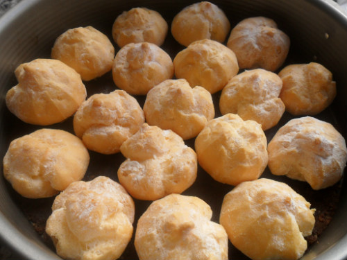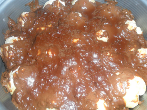 Hacemos el flan de chocolate: ponemos al fuego la nata, el chocolate y el medio sobre de flan, dejamos que hierva sin parar de remover, vertemos inmediatamente en el molde con los profiteroles.