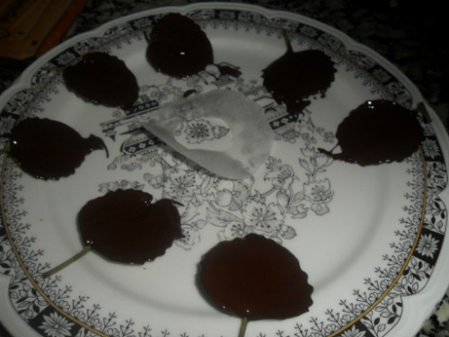 Para hacer las hojas de chocolate:: derretimos el chocolate, con una brocha impregnamos las hojas con el chocolate, dejamos enfriar y volvemos a poner mas chocolate, asta conseguir un grosor suficiente para retirar las hojas de las plantas sin que se rompa el chocolate, es suficiente con tres pasadas.