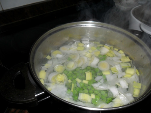 cocer el puerro junto con los guisantes en una cazuela durante 30 minutos