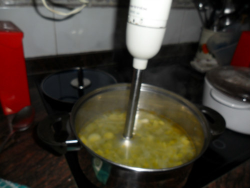 Pasarlo por la batidora hasta que quede una crema sin ningún grumo, volver a poner al fuego y añadirle la margarina cocer unos 5 minutos más, y servir en cuencos individuales, al momento de ir a comer echarle un buen chorretón de nata líquida en cada uno de ellos