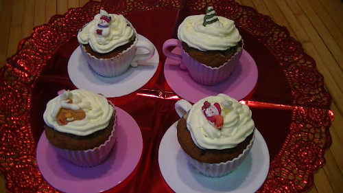 Para decorarlos batir 100 ml de nata montada con 2 cucharadas de queso de untar light. Se mete en una manga pastelera y se decora. Yo le puse encima de la nata unas galletitas que me trajo mi cuñada de Inglaterra, que según dicen es el país de las muffins y de las cupcakes