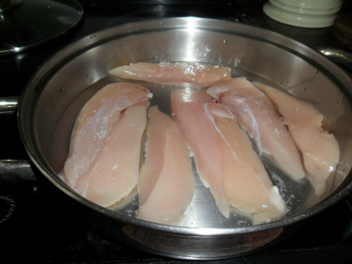 poner en una cacerola al fuego las pechugas y cubrirlas de agua, tapar y dejar cocer, si son finas es suficiente con 5 minutos.