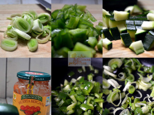 En primer lugar troceamos todas las verduras,En una cacerola ponemos la cucharada de aceite a calentar a fuego medio, mientras hacemos las verduras precalentamos el horno a 200º C , añadimos a la cacerola el pimiento y lo rehogamos durante un par de minutos, a continuación añadimos el puerro, el ajo y los salteamos durante 5 a 10 minutos, sin dejar de remover para que no se queme, por último añadimos el calabacín, el pimentón, la pimienta. Agregamos el chorrito de reducción de vinagre balsamico y salteamos la mezcla durante unos 10 minutos más.