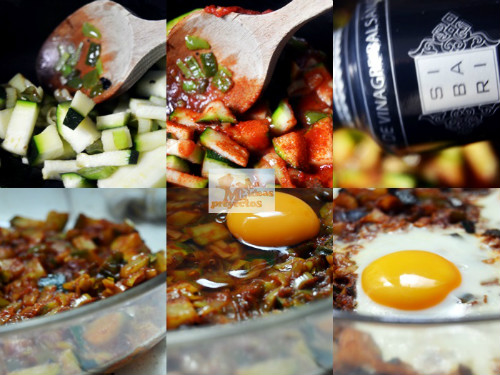 La sacamos y echamos la mezcla de verduras, hacemos unos surcos sin llegar al fondo y cascamos los dos huevos, volvemos a introducir en el horno y los dejamos que cuaje durante unos 8 minutos, ya estaran listos para comer.