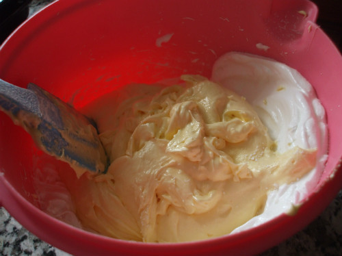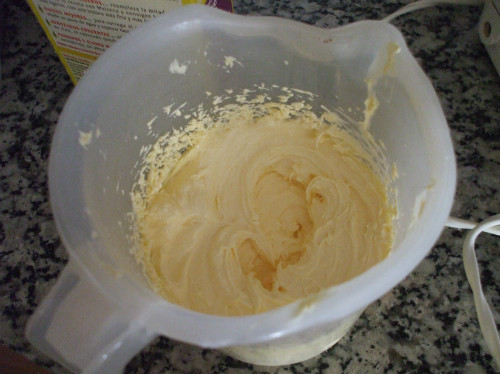 Mezcla 100 gramos de azúcar y la margarina hasta que quede una masa blanquecina. Añade tres yemas de huevo y sigue batiendo hasta que halla doblado su volumen.