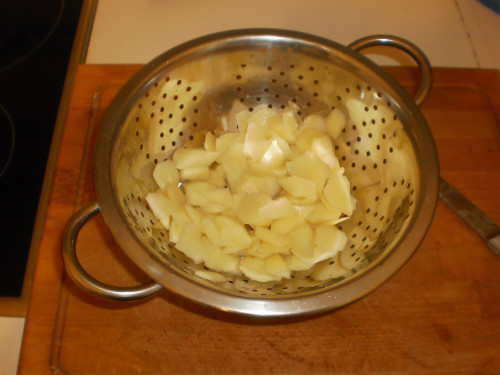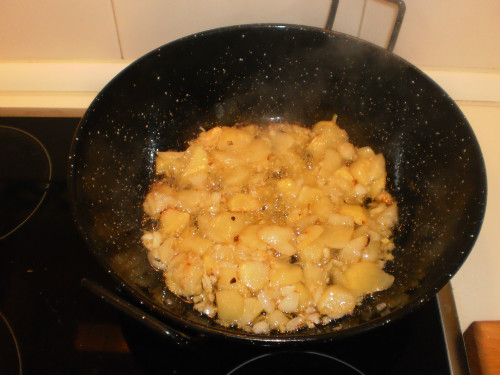 Se depositan las patatas y la cebolla en una sartén o freidora echando una alta cantidad de patatas, de forma que se consiga una patata final entre cocida y frita.