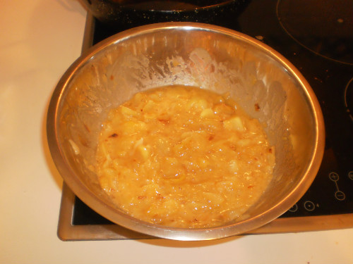 Se mezclan las patatas y la cebolla con los huevos y con la leche. Se revuelve todo con mucha energía aplastando ligeramente las patatas.