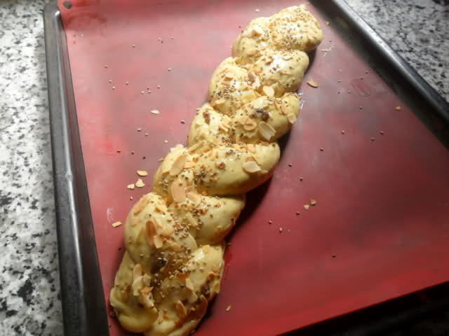 Pintamos la trenza con huevo batido, ponemos las almendras las semillas y el azúcar húmeda lo metemos al horno apagado y dejamos que vuelva a fermentar.