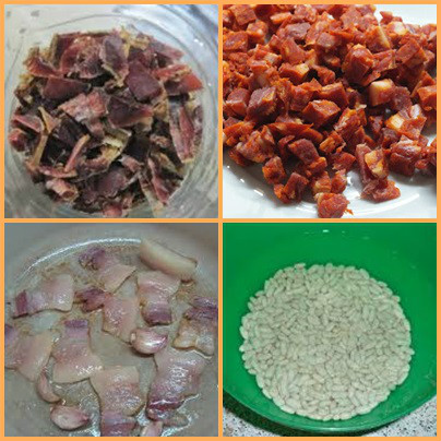 EN UNA SARTEN CON UN POCO DE ACEITE FREIR EL JAMON , EL CHORIZO Y EL TOCINO. CUANDO ESTÈN DORADOS AÑADIR LA CEBOLLETA Y EL TOMATE FINAMENTE PICADO, REHOGAR Y QUITAR PARTE DE LA GRASA.