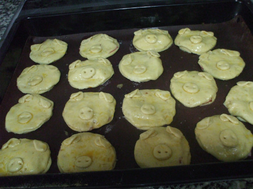 Cubrimos el cerdito con los redondeles restantes, los pincelamos con huevo batido.