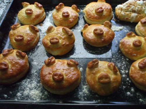 Para las orejas estiramos un poco las pegamos y las volvemos hacia adelante, como se ve en la imagen, los metemos en el horno apagado y dejamos fermentar hasta que hallan doblado su volumen.