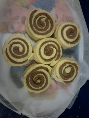 Encima de la masa de vainilla, con un pincel, extendemos la mantequilla derretida y colocamos encima la masa de cacao. La cortamos con un cuchillo afilado formando 6 tiras y enrollamos.