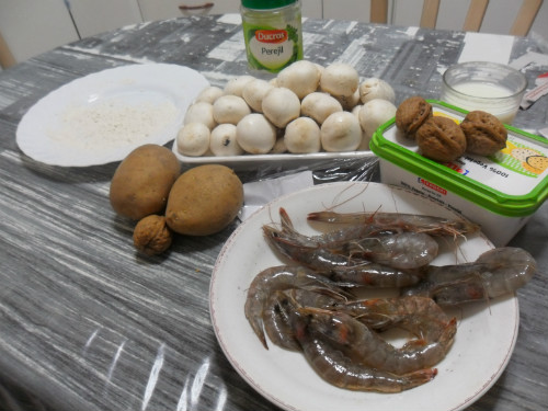 preparar los ingredientes, los langostinos pueden ser frescos o congelados, si se escogen estos últimos descongelarlos.
