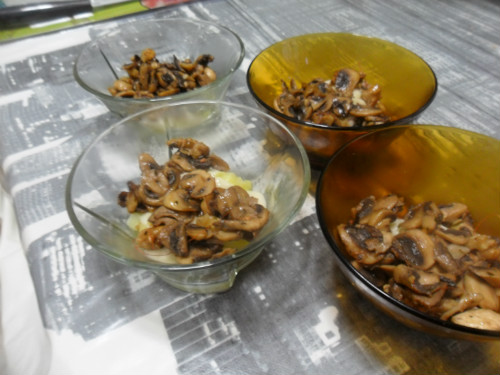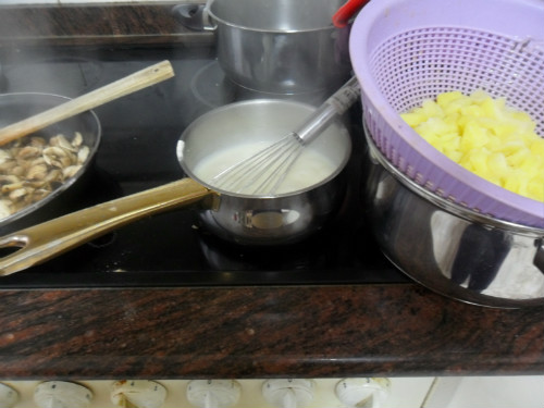 ir montando los cuencos, primero la patata, segundo la salsa bechamel