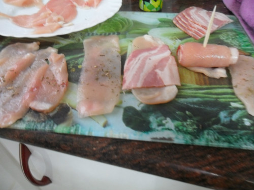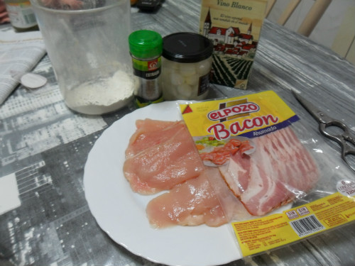 preparar los ingredientes, las pechugas tienen que estar fileteadas muy finas, partir las lonchas de bacón por la mitad.
