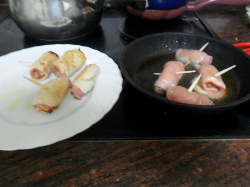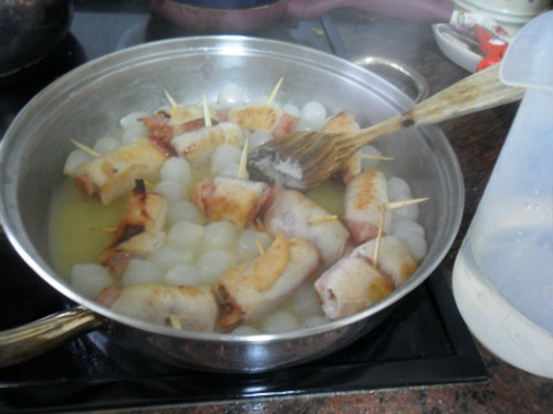 una vez que hierbe el vino, se meten en la cazuela los rollitos de pollo, se le añade un vaso de agua y se cuecen unos 15 minutos, hasta que espesa un poco la salsa