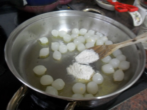 Las cebolletas las hemos pasado por agua para quitar la acidez y las hemos escurrido, en una cazuela se echa un par de cucharadas de aceite de oliva y se echan las cebolletas junto a una cucharada de harina, se tuesta la harina se añade una copita de vino blanco y se deja evaporar