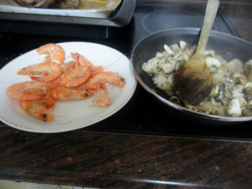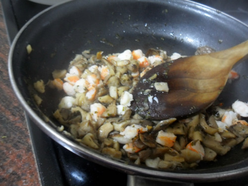 Mientras se hacen las setas, pelar los langostinos y trocearlos, mezclar todo y rehogar durante un par de minutos más.