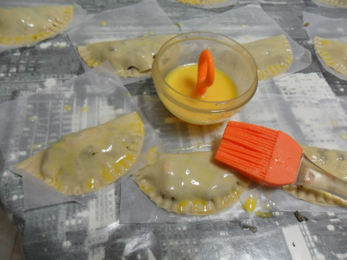 rellenar las empanadillas con el relleno de setas y langostinos, cerrar con la ayuda de un tenedor y pintarlas con huevo batido