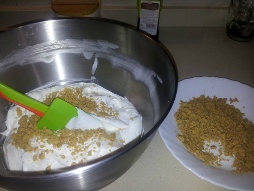 Separamos 1/3 de nata y reservamos, al resto le añadimos la tableta de turrón desmigajada con movimientos envolventes para que no baje la nata.