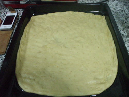 Estiramos la masa y la ponemos en la bandeja del horno pintada con un poco de aceite para que no se nos pegue y la pichamos con un tenedor.
