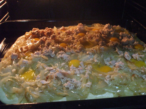 Extendemos la cebolla cubriendo todo la masa, repartimos el atún escurrido y por último ponemos los huevos.