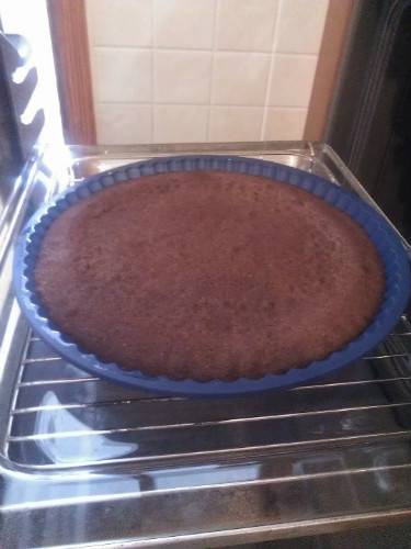 Batir las claras a punto de nieve. Añadir una cuarta parte de las claras a la mezcla anterior. Mezclar bien y seguir añadiendo las claras hasta que quede homogeneo. Verter la mezcla en el molde preparado y hornear 25 minutos a 180ºC o hasta que esté hecho. Dejar enfriar.