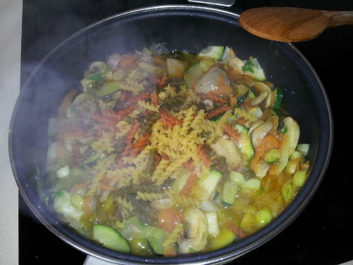 Añadimos las hélices y rehogamos.