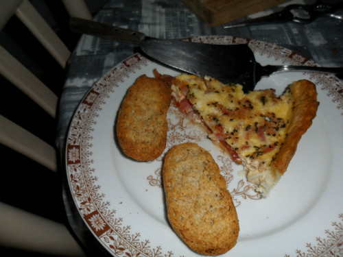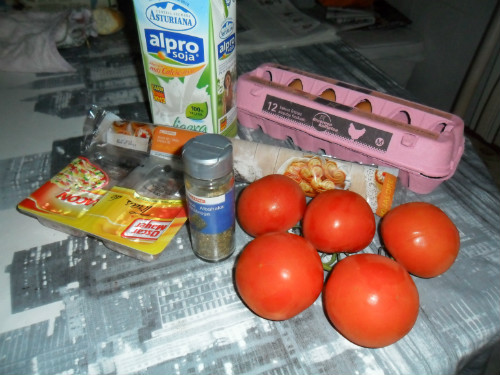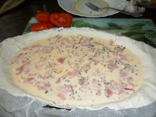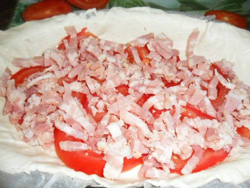 colocar la pasta de hojaldre en un molde apropiado para el horno, pinchar la base con un tenedor, colocar los tomates y el beicon cortado a tiras
