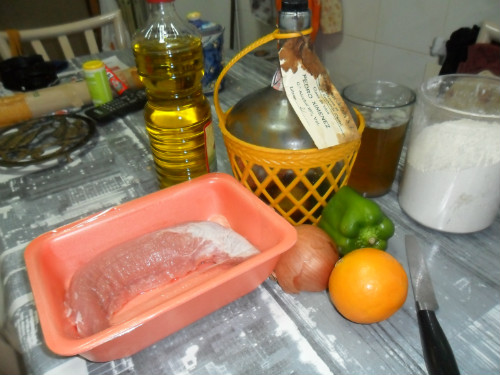 En una cazuela o sartén poner a pochar la cebolla y el pimiento, añadir la ralladura de naranja y la cucharada de harina, remover bien, añadir el vaso de vino y el de caldo, dejar reducir la salsa unos 5 minutos