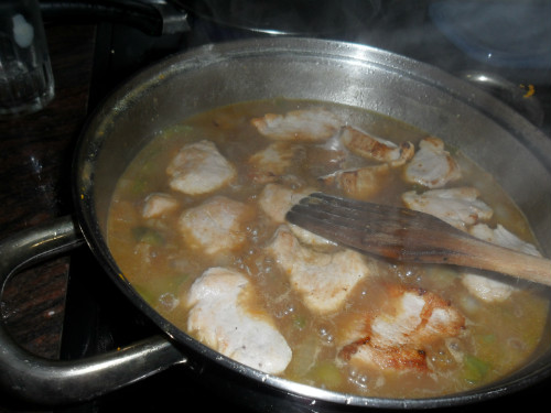 echar el solomillo y mezclarlo todo , mantenerlo unos 10 minutos a fuego medio, la salsa va espesando y cogiendo un color caramelizado.