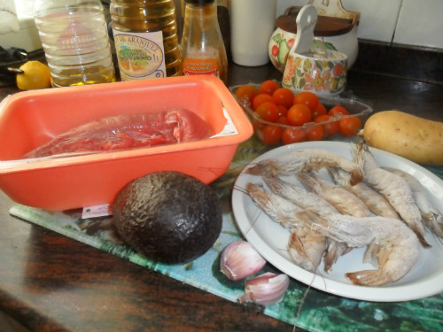 Combinado muy completo nutritivamente hablando, combina las proteínas de la carne y langostinos con patata, aguacate y tomate . Es fácil de hacer aunque lleva algo de tiempo al preparar los ingredientes por separado.