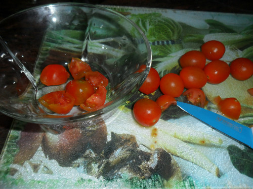 preparar los ingredientes, lavar los tomates y cortarlos a trocitos, los langostinos se pueden usar lo mismo congelados que cocidos