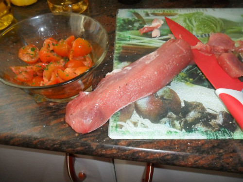 mientras se macera el tomate, preparar el solomillo, limpiarlo de las posibles telilas que tenga y cortarlo en rodajas finas