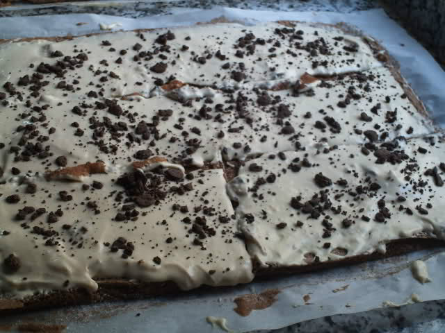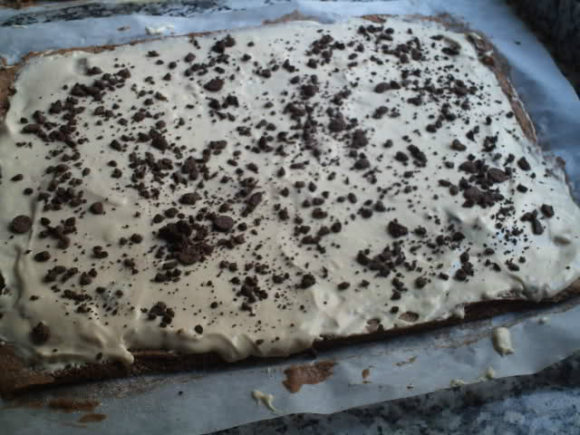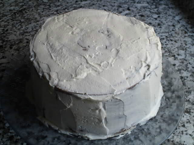 Extender el relleno cubrir la bizcocho con el relleno y poner el chocolate rallado.