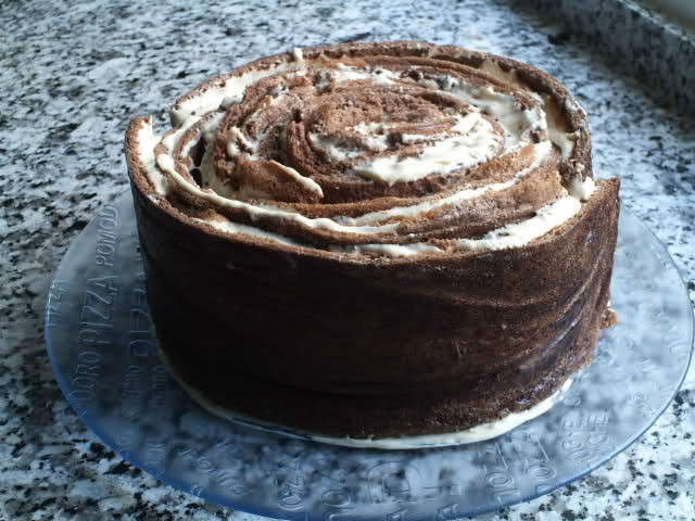 Poned en el centro de la bandeja donde vamos a montar la tarta un poco de relleno. Sobre el vamos poniendo el bizcocho liado presionando con las manos para que quede bien sellado.