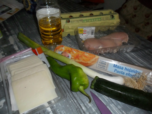 preparar los ingredientes, la masa de hojaldre lo mismo se puede coger fresca que congelada, el pimiento verde tipo italiano