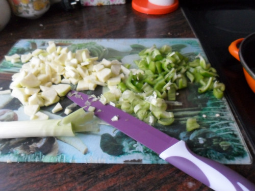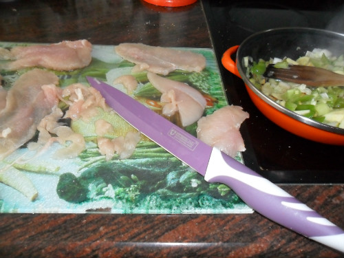 mientras se saltean las verduras picar la pechuga en trocitos muy pequeños