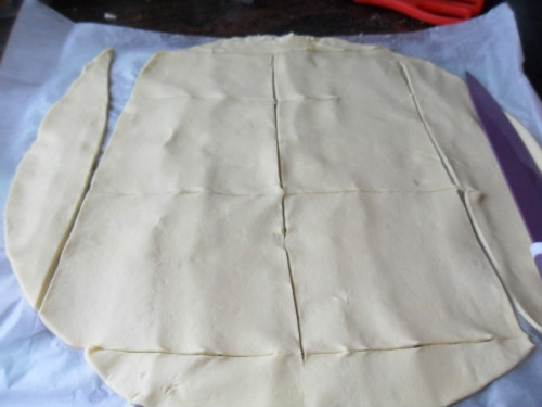 estender la lámina de hojaldre y cortarla en cuadrados según los comensales, esta receta es para 3 por lo que hay que cortar 6 cuadrados, dejar los bordes para adornar