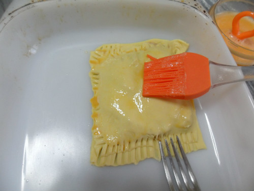 cubrir con otro cuadrado de hojaldre, unir los bordes con ayuda de un tenedor y pintar con el huevo batido. Una vez que se ha precalentado el horno, se meten los hojaldres 30 minutos a 200 º