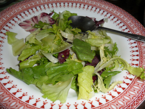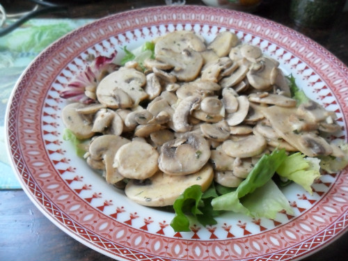 en la fuente estender las lechugas variadas, ya vienen lavadas, colocar encima los champiñones y no hace falta añadir nada más, puesto que la vinagreta los ha empapado bien.