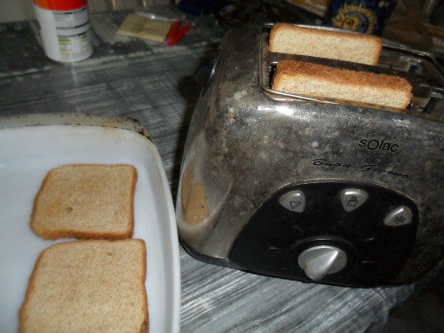 de mientras en el tostador ir tostando las rebanadas de pan de molde y colocarlas en una bandeja apta para el horno, si no se tiene tostador también se pueden hacer a la plancha