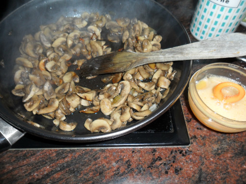 batir un huevo y cuando ya están echos los champiñones echarlo encima y preparar un revuelto, apagar el fuego y separar la sartén para que cuaje el huevo pero no se reseque