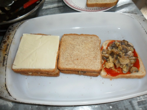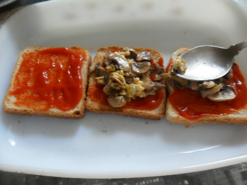 encima de las tostadas con una cuchara poner el tomate natural, encima el revuelto de champiñones, cubrir con otra tostada