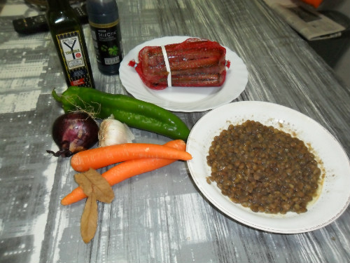 preparar los ingredientes, hemos usado lentejas que han sobrado, pero si no se dispone de ellas, se pueden usar las que vienen en conserva o cocerlas y dejar enfriar, poner las navajas en agua con sal por si tienen algo de arena