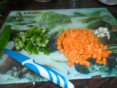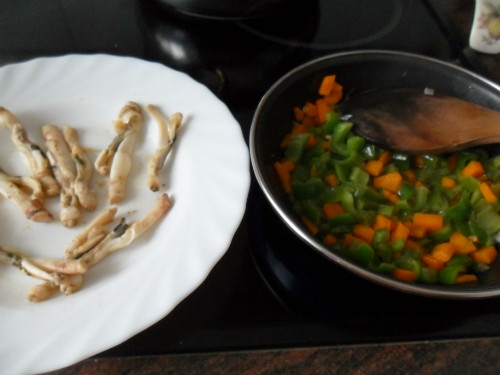 poner una sartén al fuego con una cucharada de aceite y saltear las verduras hasta que toman color, de mientras quitarle las conchas a las navajas.