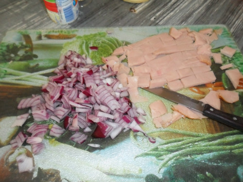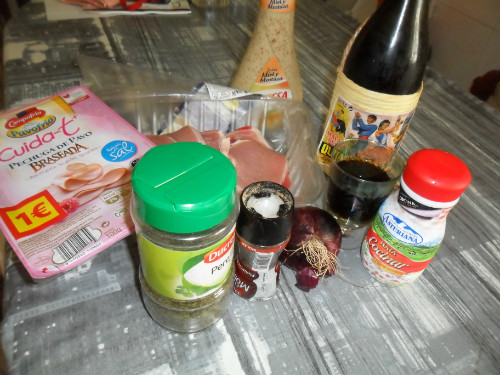 preparar los ingredientes da lo mismo usar pechuga de pavo en fiambre qué jamón york y si no se tiene salsa de mostaza con miel, mezclar 4 cucharadas de mostaza con 2 de miel y mezclar bien