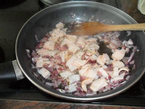 poner una sartén al fuego con 2 cucharadas de aceite, saltear la cebolla y cuando empieza a tomar color añadir la pechuga de pollo, saltear.