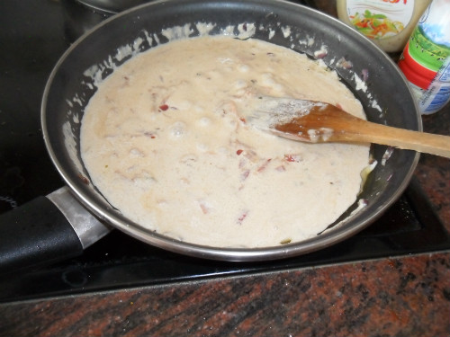añadir la nata y mantener otros 5 minutos removiendo, se obtiene una salsa espesa.
