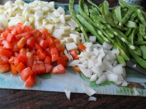 lavar las judías verdes y cortarlas a lo largo, el calabacín, cebolla y tomate cortarlo a daditos